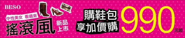 趕上2009年秋冬風潮, BESO將金屬拉鍊、鉚釘、流蘇與動物皮紋等元素注入各式鞋款中,讓BESO女孩展現原始野性的活力!就連包款也要ROCKER到底,金屬光澤的材質與鉚釘,更讓人沉浸在搖滾龐克的經典年代中!BESO讓女孩們用ROCKER態度,在生活中創造專屬的時尚品味!